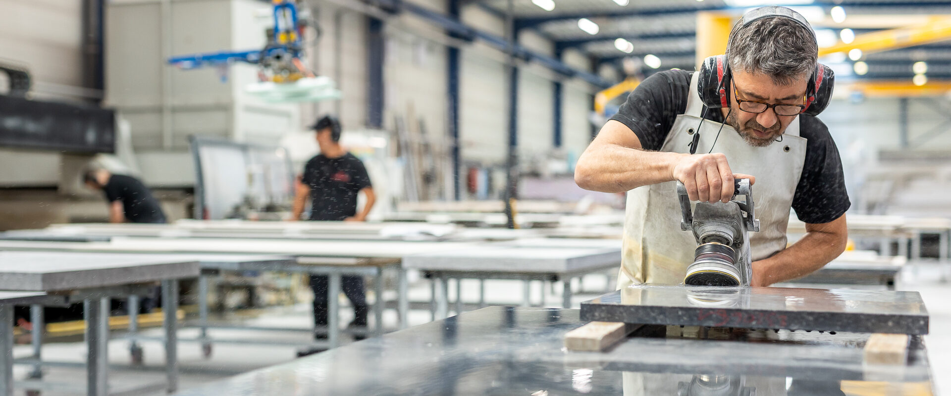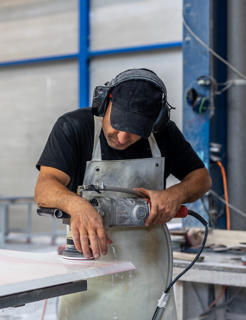 In ons atelier bewerken wij elke steen in keramiek, natuursteen, Dekton en composiet met de grootste zorg.